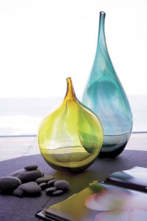 1. 造型時(shí)尚的玻璃器皿和海邊隨處可見的石子被擺放在房間一角,處處體現(xiàn)了設(shè)計(jì)者的匠心獨(dú)具。