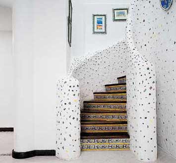 以磚和白水泥壘砌出的旋轉(zhuǎn)樓梯,簡單而具有雕塑般的特點。樓梯兩側(cè)的實心設(shè)計仿佛通向童話城堡的白色山崖,星星點點的彩色斑點就像是海風(fēng)吹過來的小貝殼。