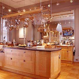 廚房:廚房在美國人眼中一般是開敞的(由于其飲食烹飪習慣),同時需要有一個便餐臺在廚房的一隅,還要具備功能強大又簡單耐用的廚具設備,如水槽下的殘渣粉碎機,烤箱等。需要有容納雙開門冰箱的寬敞位置和足夠的操作臺面。在裝飾上也有很多講究,如喜好仿古面的墻磚、櫥具門板喜好用實木門扇或是白色模壓門扇仿木紋色。另外,廚房的窗也喜歡配置窗簾等。