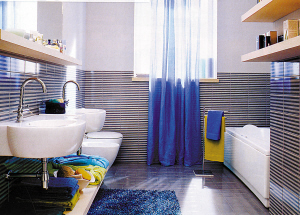 在長方形的灰白浴室里,面盆和坐便器安排在同一側(cè),另一側(cè)用來安放浴缸,清晰的空間規(guī)劃讓人一目了然。分別在面盆下和一人高的墻面位置,安裝用來收納衛(wèi)浴雜物的擱板。藍色的窗簾,讓空間滲入了海洋的涼爽氛圍。橙色、綠色的毛巾與藍色毛巾搭配,降低過分素凈的感覺。