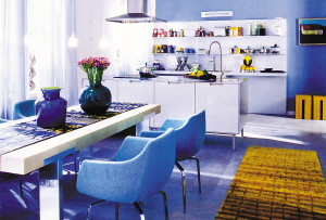 整理得一塵不染的餐廚空間,需要用少量鮮花和鋁質(zhì)品略作裝點,給湛藍的環(huán)境增添幾樣亮眼的顏色。在利落的空間布置下,清涼感愈見純粹。在餐廳掛上一幅黑白灰裝飾畫,可以提升空間情調(diào)。在經(jīng)常行走的餐廳與廚房通道之上,鋪一塊如沙灘般的米黃色地毯,表現(xiàn)出居家溫馨感,空間設(shè)計因而變得更加完整。