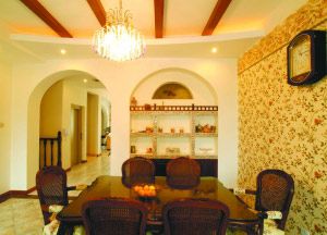 設(shè)計(jì)思路:在餐廳入口處做了圓拱形埡口,為了讓視覺上不突兀,埡口旁邊的墻壁設(shè)計(jì)一個(gè)拱形酒柜,與門廳埡口呼應(yīng),組成雙拱構(gòu)圖。在酒柜上方的小拱形開窗可改善隔壁衛(wèi)生間的采光。利用多個(gè)圓拱形結(jié)構(gòu)達(dá)到重復(fù),但在大的重復(fù)前提下,又各有特點(diǎn)。
