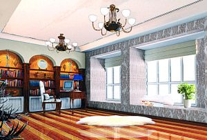設(shè)計(jì)思路:該設(shè)計(jì)的重點(diǎn)是書房的靠墻書架,利用三個(gè)圓拱形造型和4個(gè)簡(jiǎn)化的羅馬柱將整面墻的書架分成三部分,避免了整排書架帶來(lái)的壓抑感。而拱形墻面中的大面積黃色與咖啡色的簡(jiǎn)化羅馬柱更突出了書房的溫馨與穩(wěn)重的美式格調(diào)。