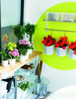 設(shè)計(jì)思路:休閑區(qū)的墻面用綠色圓形做了背景處理,并在綠**域內(nèi)設(shè)置了擱板,便于收納小東西。而在擱板下方,考慮到裝飾性與實(shí)用性的結(jié)合,利用三個(gè)小掛袋放了三盆鮮花,既作為漂亮的墻面裝飾,也可以當(dāng)作花架使用。三個(gè)花盆的重復(fù)使用,強(qiáng)調(diào)了墻壁的裝飾作用,使休閑區(qū)更有氣氛。