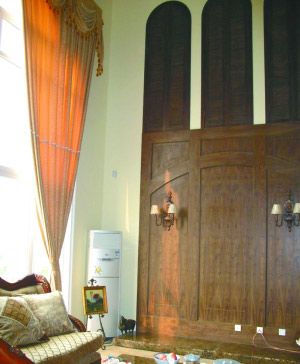 設(shè)計(jì)思路:這是歐式風(fēng)格的挑高客廳,電視背景墻采用木頭包墻加歐式壁燈。在電視背景墻的上方是樓上的窗戶,因?yàn)橐碗娨暠尘皦Ρ3忠恢?,所以做了三個(gè)木頭的對(duì)開門小窗戶,利用三個(gè)同樣的元素設(shè)計(jì),使整面墻看起來(lái)風(fēng)格一致,不空虛。
