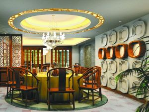 設(shè)計(jì)思路:這個(gè)餐廳以中式傳統(tǒng)的圓形為基本造型,吊頂和地面設(shè)計(jì)都突出了圓的主題,而在墻壁上,采用石膏線做出16個(gè)圓形的浮雕造型,在突出文化氛圍時(shí)又不墨守成規(guī),在中間一排的造型中又增加變化,營(yíng)造出移步換景的裝飾效果。