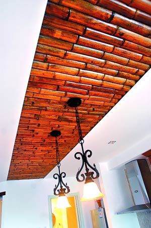 設(shè)計(jì)思路:本案例中使用的頂面裝飾是把一根根的竹子從中間分開后,依次排列在頂面做好的溝槽中,形成了頭頂上一道美麗的風(fēng)景。竹子的裝飾充滿自然色彩,與目前所推崇的自然、環(huán)保、綠色家居潮流相契合