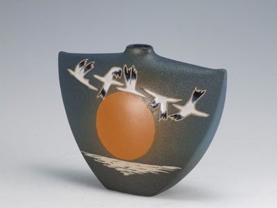 這種由江蘇丹陽姜氏彩陶有限公司生產(chǎn)制作的姜氏現(xiàn)代彩陶實(shí)際上包括了幾種類型,其中主要有彩釉陶、無光釉陶、玉珠釉陶、刻花陶和色泥彩繪陶等,手法多樣,種類繁多,給人留下的印象確實(shí)是多姿多彩,變化萬千,具有現(xiàn)代審美特點(diǎn),充滿新意,盡管有的作品還在嘗試階段,還不夠成熟,還存在著明顯的缺點(diǎn),但就整體而言,豐富多彩的現(xiàn)代彩陶藝術(shù)已經(jīng)構(gòu)成了一副美麗的圖畫,使人欣賞之后感到愉悅,看到了美的創(chuàng)造。
