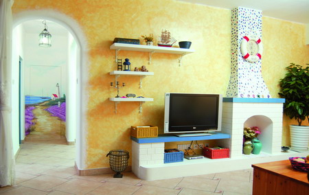 ●空間亮點(diǎn)二:圓拱帶出海洋味。不管是書房的開放入口,還是墻上的裝飾閣,整體都是圓拱的形狀。這是地中海風(fēng)格的典型特征之一。制作過程比較麻煩,先要用木板支模,然后用紅磚砌出拱門,最后用水泥抹面,盡量把線條抹圓潤一些;然后刷上白色就可以了。