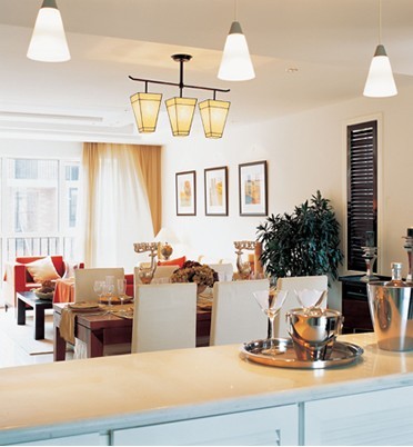 在廚房里設(shè)置一個吧臺,是這是品位人士追求生活質(zhì)量的寫照。試想,在一個開放式的廚房里,細(xì)心的主人只將具有分割功能的餐桌稍加點綴,就把它變成一個簡單而漂亮的小吧臺。餐桌的上方設(shè)計一道弧形的窗口,在配上精致小巧的罩燈,餐桌上再擺放些有情趣的藝術(shù)品,色彩上再強(qiáng)調(diào)一些現(xiàn)代感元素……