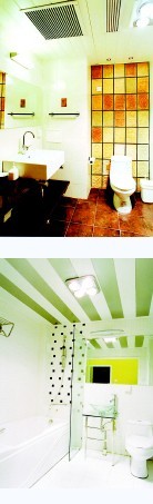 此衛(wèi)生間較有特色的是頂面的處理,采用了桑那房使用的松木,讓衛(wèi)生間有了一絲溫暖的感覺(jué)。