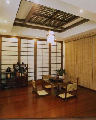 適用于和式風格或是現代風格的空間,一般采用簡潔大方、線條流暢、色彩淡雅的設計。茶室中多采用實木地板,再配以原木的矮桌和舒適的坐墊直接鋪設在地面上,桌上的紅木托盤中擺放著全套茶具。日式風格的茶室經常采用格子的圖案作為裝飾,比如在餐桌上鋪上潔凈素淡的格子布的桌巾,邊上放一盞簡簡單單、罩子同為格子花紋的白色紙燈,儼然是清新典雅的日式格調。