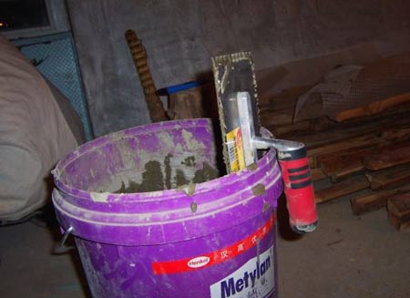 加水攪拌完待用。。。漢高的大桶可立功了,沒少利用。。。 中間一陣忙亂,把切下來的擠塑板臺面粘好了,哎,3個月沒干,手生了。。。忙的忘照相了。。。等再照時,已經(jīng)進行一大半了。。。
