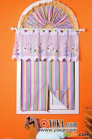 5.設(shè)計(jì)窗簾時(shí)要注意因勢(shì)利導(dǎo)、因人而異,根據(jù)窗戶的特點(diǎn)和使用者的性格特征來(lái)設(shè)計(jì)。此間兒童房的窗簾采用分體式設(shè)計(jì)。上半部圓弧形部分是用棉布做出自然褶度的異型窗簾,以魔術(shù)貼固定在窗框上,拆卸清洗均十分方便;下半部則是用彩色條紋棉布制成的卷簾,在卷簾下部開了個(gè)高叉,兩邊則配以紐扣和紐孔。這樣,即使卷簾放下的時(shí)候,也能很方便地把卷簾一角掀開,以紐扣在相應(yīng)部分固定好,以獲取光線,符合兒童的需要。