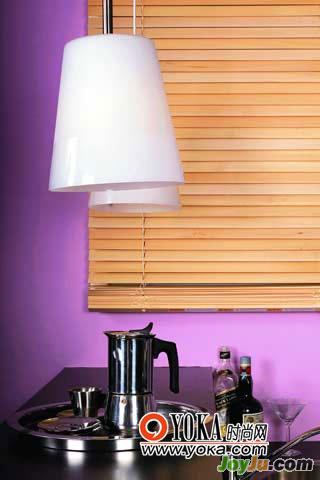 8.選擇窗簾的材質(zhì)時(shí),要視所在居室的功能而定。此處為廚房一角辟出來(lái)的一個(gè)小型吧臺(tái),旁邊為洗手池,不遠(yuǎn)即為灶臺(tái),因此,選擇木質(zhì)百葉作為窗簾。用原木木粉有機(jī)合成的簾片可以防水,不會(huì)霉變,而且防火阻燃,也不易變形。除此之外,適合在廚房應(yīng)用的還有蜂巢簾,既隔熱,又防水。