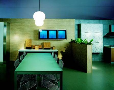 輕松舒爽、心曠神怡的色彩。綠色是永遠(yuǎn)用不完,永遠(yuǎn)不會(huì)讓人感到厭煩的主題,因?yàn)樗拿恳稽c(diǎn)變化,都對(duì)應(yīng)著自然給人類的印象,所以綠色適合所有喜歡它的人。從淡綠轉(zhuǎn)化為灰綠,然后暗紫,完成室外到室內(nèi)的過渡,對(duì)應(yīng)了人的視覺對(duì)空間的自然反應(yīng)。淡綠如田野的地板,黃色如秋葉的柜體,墨綠如松針的臺(tái)面,構(gòu)成一幅自然景色,使人心情豁然開朗。淡綠與淡藍(lán)的配合,則使廚房布滿盎然生氣。生活在淡綠的空間里,夢(mèng)都是清新的。明快而錯(cuò)落的綠,讓人仿佛來到青山翠谷。