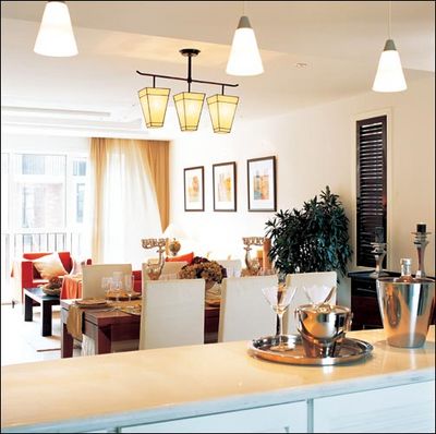 一般除餐桌、餐椅和燈具外,可以根據(jù)主人的愛好和空間大小搭配酒柜、展示柜、酒車等,再配以適當(dāng)?shù)木G色植物和裝飾畫,墻面的色調(diào)盡量用淡暖色,以增進(jìn)食欲。燈具選擇可以不受空間高低的限制,選擇主人喜歡的吊燈。