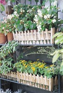 圍籬能讓原本零散的盆栽,收納成有整體感的花壇。最常見可用能任意調(diào)整圍形的籬笆、木樁,或者發(fā)揮創(chuàng)意,自行用木頭、砌磚圍起也行。另外折迭式的籬笆則可用來美化長型花器。