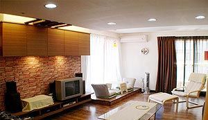 為了遮蓋原有衡梁問題,天花板采用15公分射燈以及平面式層板設計,后再利用胡桃木壓條片做局部天花板造型變化。
