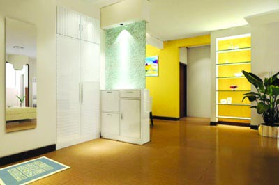 入口的正立面做了一個簡單實(shí)用的玄關(guān)柜,下面為鞋柜。鞋柜上方是塊透光不透明的裂紋玻璃,通過玻璃上面的射燈打下強(qiáng)光。