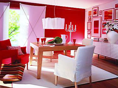 餐廳看起來好漂亮,精致的漂亮。餐廳以紅色和白色為主,看起來色彩分明,視覺效果很不錯。餐廳沒有采用普通的窗簾,而采用了日式風(fēng)格的窗簾,特別又漂亮。白色吊燈裝的也很有特色遠遠看起來像是朵很大的花,別致。白色的地毯與頂墻正好相呼應(yīng),這樣就不會有“頭重腳輕”的感覺了。白色的墻壁上掛滿了大小不一的畫,大多數(shù)還是以紅色為主整體搭配的巧妙。
