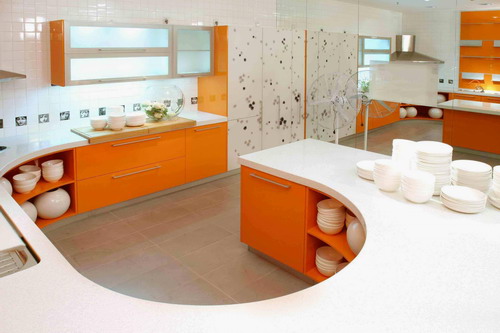 視覺效果是否整潔、輕松是春季廚房設計的關鍵。橙色地柜、白色的臺面巧妙搭配,顯得清新飄逸,令人心曠神怡。U型臺面設計獨特時尚,更增加了操作空間。