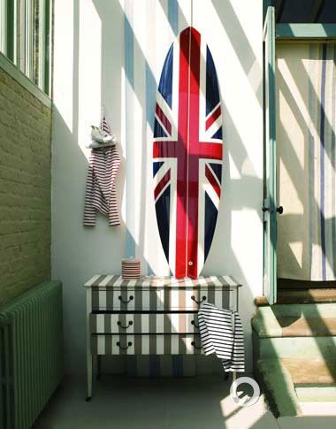 一個(gè)灰褐、白色相間的手繪抽屜柜,英國(guó)國(guó)旗紋樣的沖浪板乃至條紋T恤衫和窗外斑駁的日光,都悄悄印證著條紋對(duì)空間強(qiáng)大的裝飾力和塑造力。