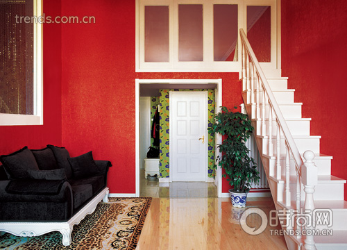 大廳的墻是紅色,很扎眼,但家具是白色的,窗簾是黑色的,這幾種顏色搭配起來特別鮮明。樓道吉米選擇綠配紫,屬于對撞的顏色里最沖突的,吉米說只有這樣才會把主題包括主人的個性充分表達出來,非暖即冷,反正不會選擇中庸。