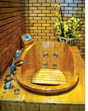 如果真的追求古人沐浴的感覺,這款圓木桶應(yīng)該是最好的選擇,跟在電視上看到的模樣幾乎一樣,只是感覺用材更優(yōu)良,不必?fù)?dān)心發(fā)霉,而且還加了個小梯子,更顯人性化。要不這么高的木桶,還真該考慮要怎么走進(jìn)去。在木桶里灑上些花瓣,就和想象中的古人沐浴更加接近了;如果覺得那還不夠愜意,盡可以倒些牛奶、啤酒進(jìn)去,古今結(jié)合,定能洗出一身好皮膚。