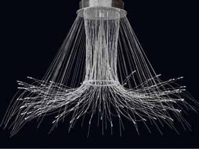 吊燈有著啟發(fā)性設(shè)計(jì)和強(qiáng)烈沖擊感。精細(xì)閃耀的重復(fù)線條向周圍擴(kuò)散,就像王冠。彎曲和拉緊的線條相結(jié)合,使其特別適合于所表現(xiàn)的氛圍。