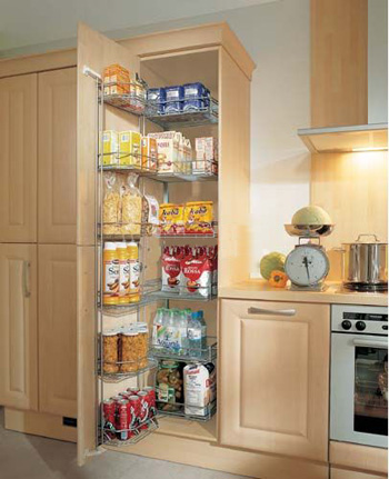 目前最新款的櫥柜,吊柜門不是平開式的,而是能下拉,吊柜格柵和層架也能隨著柜門下降到方便取放的地方。