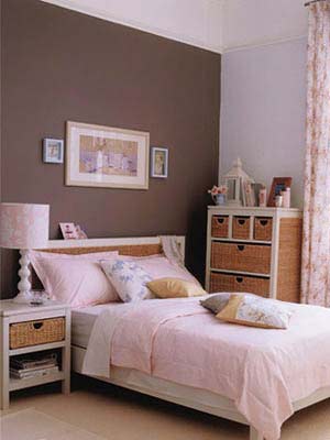 粉紅色的墻面定下整體基調(diào),給人以朦朧的浪漫感覺?;野咨蛎靥海约鞍咨昂熍c粉紅色過度十分自然。白色的床邊小桌和柜子仍然帶藤制抽屜,桌上放有藍(lán)色托盤和藍(lán)色臺(tái)燈,是整體色調(diào)中活潑的一筆,柜子上飾以小圓鏡、藍(lán)色花瓶和小花枝?;野咨拇采细惨苑奂t色的床罩,白色床單、白色枕頭、藍(lán)、粉色小靠墊,溫暖而舒適。