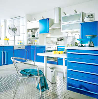 藍(lán)色,是一種令人產(chǎn)生遐想的色彩。傳統(tǒng)的藍(lán)色常常成為現(xiàn)代裝飾設(shè)計(jì)中熱帶風(fēng)情的體現(xiàn)。藍(lán)色還具有調(diào)節(jié)神經(jīng)、鎮(zhèn)靜安神的作用。藍(lán)色清新淡雅,與各種水果相配也很養(yǎng)眼,但不宜用在餐廳或是廚房,藍(lán)色的餐桌或餐墊上的食物,總是不如暖色環(huán)境看著有食欲;同時(shí)不要在餐廳內(nèi)裝白熾燈或藍(lán)色的情調(diào)燈,科學(xué)實(shí)驗(yàn)證明,藍(lán)色燈光會(huì)讓食物看起來不誘人。但作為衛(wèi)浴間的裝飾卻能強(qiáng)化神秘感與隱私感。