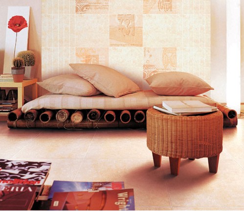 客廳的輪廓以斜插竹桿、磚體屏風劃分,豪華的歐式吊燈與熱情洋溢的“威尼斯春天”系列地磚上下呼應,真皮沙發(fā)套裝,硬木茶幾,墻面是由墻壁上凹凸混鋪的瓷磚和茶色的反光鏡片巧妙的穿插。整個客廳活潑而不炫亂,更顯現(xiàn)代風尚,無論新朋舊友皆可由衷感受到主人的熱情好客與雍容大方