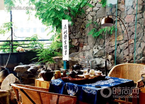 大可運用大量的山石和藤蘿將戶外設(shè)計得古色古香,主人不僅在此品茗,更在此**讀書。