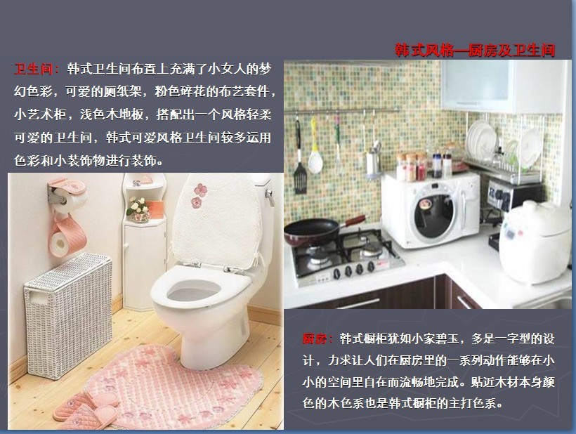 衛(wèi)生間:韓式衛(wèi)生間布置上充滿(mǎn)了小女人的夢(mèng)幻色彩,可愛(ài)的廁紙架,粉色碎花的布藝套件,小藝術(shù)柜,淺色木地板,搭配出一個(gè)風(fēng)格輕柔可愛(ài)的衛(wèi)生間,韓式可愛(ài)風(fēng)格衛(wèi)生間較多運(yùn)用色彩和小裝飾物進(jìn)行裝飾。