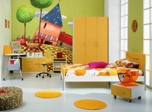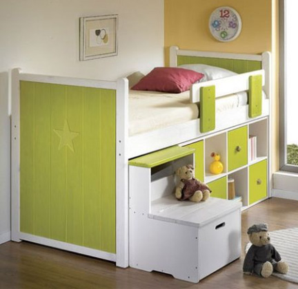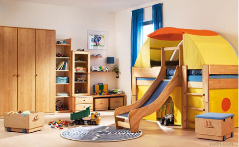 學(xué)齡前的房間中,為保證孩子的身體健康,兒童房中的家具都選用環(huán)保的實木家具,并鋪設(shè)實木地板。因為孩子年齡小,又好動,宜選用低矮的兒童床,以免孩子睡覺時“不老實”而翻下床。