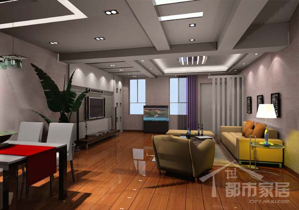 進(jìn)入一層空間,相信各位已經(jīng)被吊頂吸引住了吧!沒錯(cuò),客廳和餐廳處在同一空間的時(shí)候,一般的做法是在天花板做出分割吊頂,把兩塊功能區(qū)域分開,再?gòu)?fù)雜些的就是在沙發(fā)、茶幾以及餐桌上方做出吊頂,進(jìn)一步劃分空間。而在本案中大家能夠發(fā)現(xiàn),電視上方和圖片最近端又做出了比較復(fù)雜的吊頂,這樣以來(lái)整個(gè)吊頂“看點(diǎn)”確實(shí)非常多。