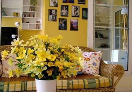 首先來(lái)一張客廳近景圖;這是一套迷人的黃色系婚房;從家居設(shè)計(jì)到家居擺設(shè)可以看出房主是個(gè)可愛的糖果女孩子。