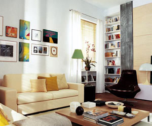 整個客廳沒有任何過于搶眼的顏色清新的米色、黃色、淡綠色在黑色單人坐椅和灰色木質墻飾的點綴下更顯柔和電視機背后的墻面兩側裝有高達天花板的白色書架用于收納書籍,成為一面值得賞玩的背景墻,窗下空間也被充分利用,沙發(fā)背后的墻壁上,多幅收藏的裝飾畫在此集中展示,更是一種不著痕跡的收納妙法