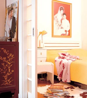 雖然這種布局不夠通透,但這些分隔都是適合現(xiàn)在生活狀態(tài)的必然選擇。白色家具配合黃、紅、棕色的點(diǎn)綴,營(yíng)造出濃濃的新婚氣氛和溫馨感。