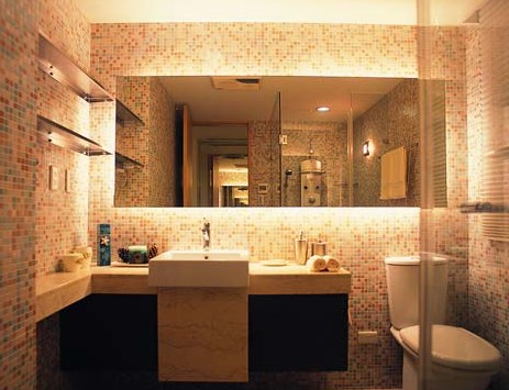 在鏡面上安裝壁燈照明效果比較好。在洗臉盆的附近上方,還可以安上可插式電插座,供吹風機、刮須器器具使用,要注意的是插座上應有防水蓋板。