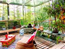 陽臺作為休閑區(qū),還得種上些綠色植物、花卉才好,如常青藤類的植物在夏天攀爬于陽臺上,顯得生機盎然,不僅起到了裝點墻面的作用,還有利于人體健康。為了使陽臺更富于情趣,不妨把游山玩水時帶回來的各具特色的小飾品掛于側墻上,一個小小的陶瓷壁掛,或用草、麻、葦等編織成的工藝品都可以提升陽臺的韻味。