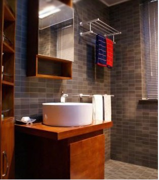 由于8平方米的浴室已經(jīng)比較寬敞了,所以可容納一些簡單的小家具。拿一把椅子放在浴缸旁邊,可以放浴巾,可以掛衣服,可以堆雜志,也可以讓親愛的那位坐著為你按摩。椅子要防水,木的藤的都可以考慮,適合浴室里用的椅子最好沒有扶手,簡約、輕便、方便移動。