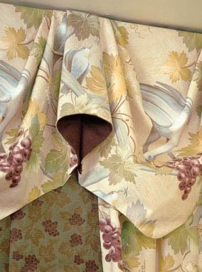 窗簾:絲絨靠背沙發(fā)是這處小空間的設(shè)計靈感來源,雖然沙發(fā)上的條紋色彩豐富,但是這些顏色卻過于柔和,因此設(shè)計師為羅馬簾特意選擇了亮麗的圖案。紫色的葡萄圖案正如一劑***注入進(jìn)來,讓羅馬簾立刻充滿了生機(jī)和活力,而窗簾則選擇了綠色和咖啡色為主的色調(diào),以此來烘托羅馬簾。在賦予設(shè)計化的帷幔和窗簾的組合下,餐廳呈現(xiàn)出了正式場合的莊嚴(yán)。層疊窗飾的實用功能并不很大,卻起到了很好的裝飾作用,而這間餐廳窗簾的功用主要是來自羅馬簾。帷幔既有立體感,還能看到鳥的裝飾圖案。