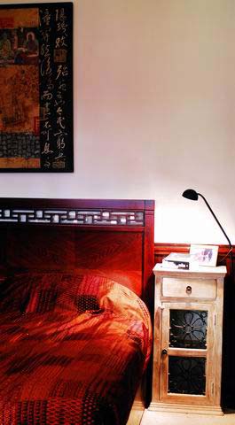 廂房也是簡(jiǎn)約風(fēng)格,有百年歷史的中式木質(zhì)大床搭配沒(méi)有任何圖案的床單和窗簾,氣質(zhì)坦白飄逸;用來(lái)分隔空間的帷幔用的是正紅色,紅色擁有很好的歸依感和私密性,但面積過(guò)大有些單調(diào),剛好,手工縫制的有亮片和刺繡的東南亞風(fēng)格靠墊玲瓏精致,中和了這份單調(diào)。
