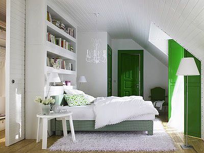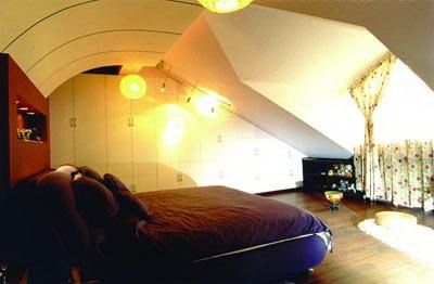 這樣的臥室比較多:斜頂中凹陷一大塊面積形成天窗(俗稱老虎窗)。一般,這樣的臥室室內(nèi)空間面積不大,但斜頂凹陷的天窗開口很大,無論通風(fēng)和采光條件都很好。