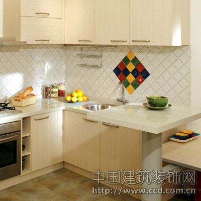 小面積廚房一方面要注意功能完備,更要注意最大限度地提高空間利用率,所以盡量把能放起來的東西都收進去,讓臺面顯得清爽。 上柜和下柜之間的空間可以設(shè)計一幅墻面擱架,把零七八碎的盤、杯等全部收納。