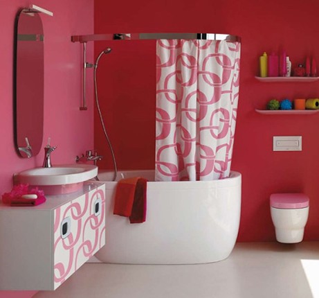 由粉紅色和白色構(gòu)成的圖案是女孩的最?lèi)?ài)。也可以選擇這種圖案的防水壁紙來(lái)提升浴室的可愛(ài)度,甚至可以把各種卡通造型的皂盒、浴液瓶統(tǒng)統(tǒng)擺放在臺(tái)面上。但浴室柜則不要選擇顏色過(guò)于沉重的,白色的剛剛好。