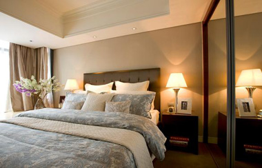 臥室依然大面積采用淺色調(diào),濃咖啡色的床頭柜和濃咖啡色的床,恰到好處的避免了臥室色彩的輕重失調(diào)。大面的鏡子在視覺上大大增加了臥室的空間。床頭柜上Harbor House白貝母相框和座鐘,滲出一點高雅與脫俗。床頭燈柔和的燈光又能讓臥室不失溫馨與親切。